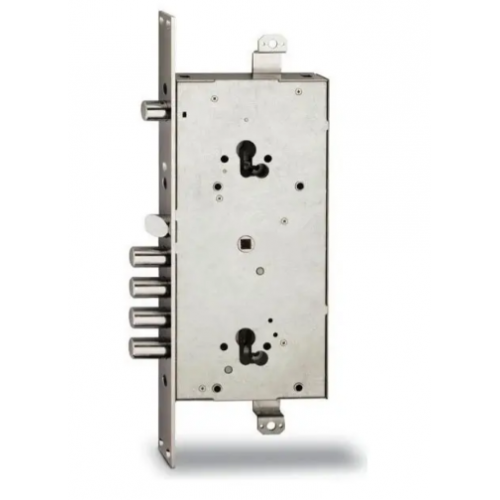 Замок врізний комбінований із засувкою для установки на металеві двері. 4 основних ригеля управляються першим циліндровим механізмом, додатковий ригель - другим циліндровим механізмом, засувка - ручкою (посередині). редукторна передача