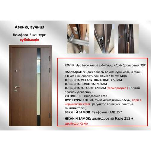 3 петлі, ручка на розетці, ексцентрик, нічний засув, утоплена броненакладка, поріг із нерж.сталі, торець полотна зашитий МДФ, ТЕРМОРОЗРИВ коркове дерево