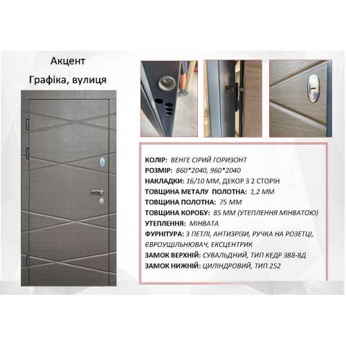 | Фурнітура* | 3 зовнішні петлі, ручка на розетці,євроущільнювач, антизрізи, ексцентрик, БЕЗ ВІЧКА | ||||