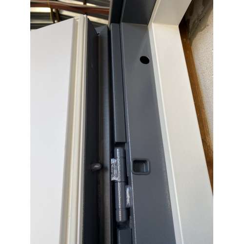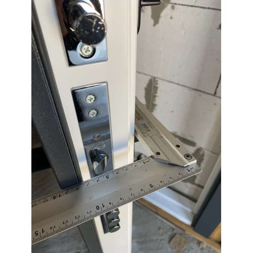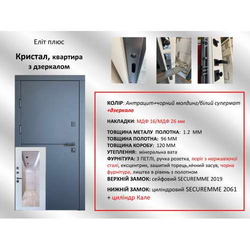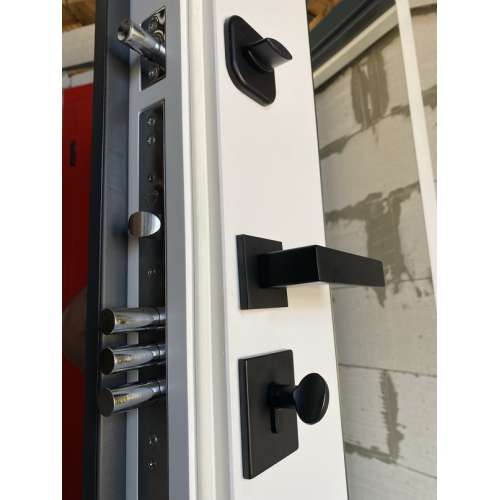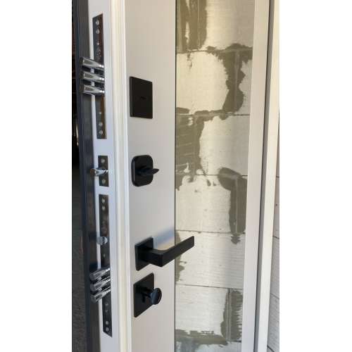 3 зовнішні петлі, ручка на розетці, антизрізи, поріг з нерж.сталі, ексцентрик, торець полотна зашитий МДФ, нічний засув, чорна фурнітура