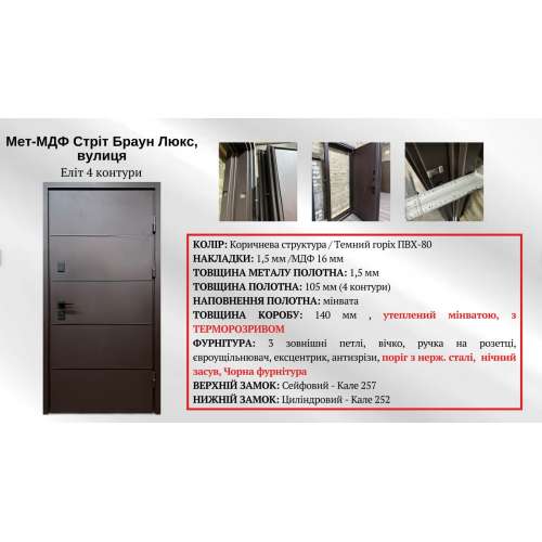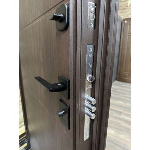 | Фурнітура* | 3 петлі, ручка на розетці, ексцентрік, поріг із нерж.сталі, нічний засув, чорна фурнітура |