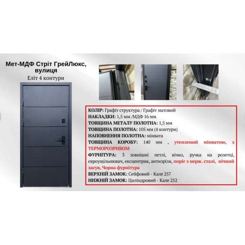| Фурнітура* | 3 петлі, ручка на розетці, ексцентрік, поріг із нерж.сталі, нічний засув, чорна фурнітура |